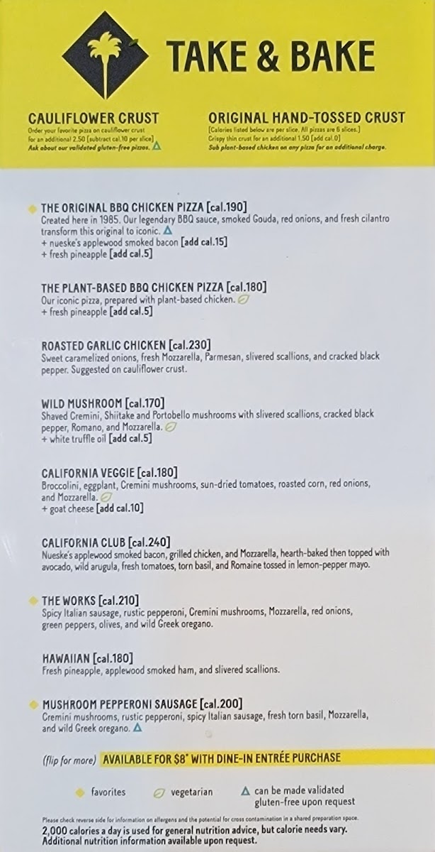 Nueske’s applewood smoked bacon, grilled chicken, and Mozzarella, hearth-baked and served with slices of avocado, fresh tomato, basil, and Arugula tossed in mayo. [Calories listed are per slice. All pizzas are 6 slices.]